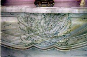 Проект и дизайн разработан Евгением. Рисунок- клиновый лист и несколько листиков дуба, по согласованию с заказчиком. Установлена электрическая топка, так как камин смонтирован на втором этаже девятиэтажного дома. Камень – греческий мрамор Аякс. Колонны- блочки, фасад камина слябы толщиной 2 см. Камин полностью отшлифован и отполирован. Размер облицовки 1,35х1,1 м. В комплекте с камином изготовлен резной мраморный стол. Срок изготовления камина от двух с половиной месяцев.